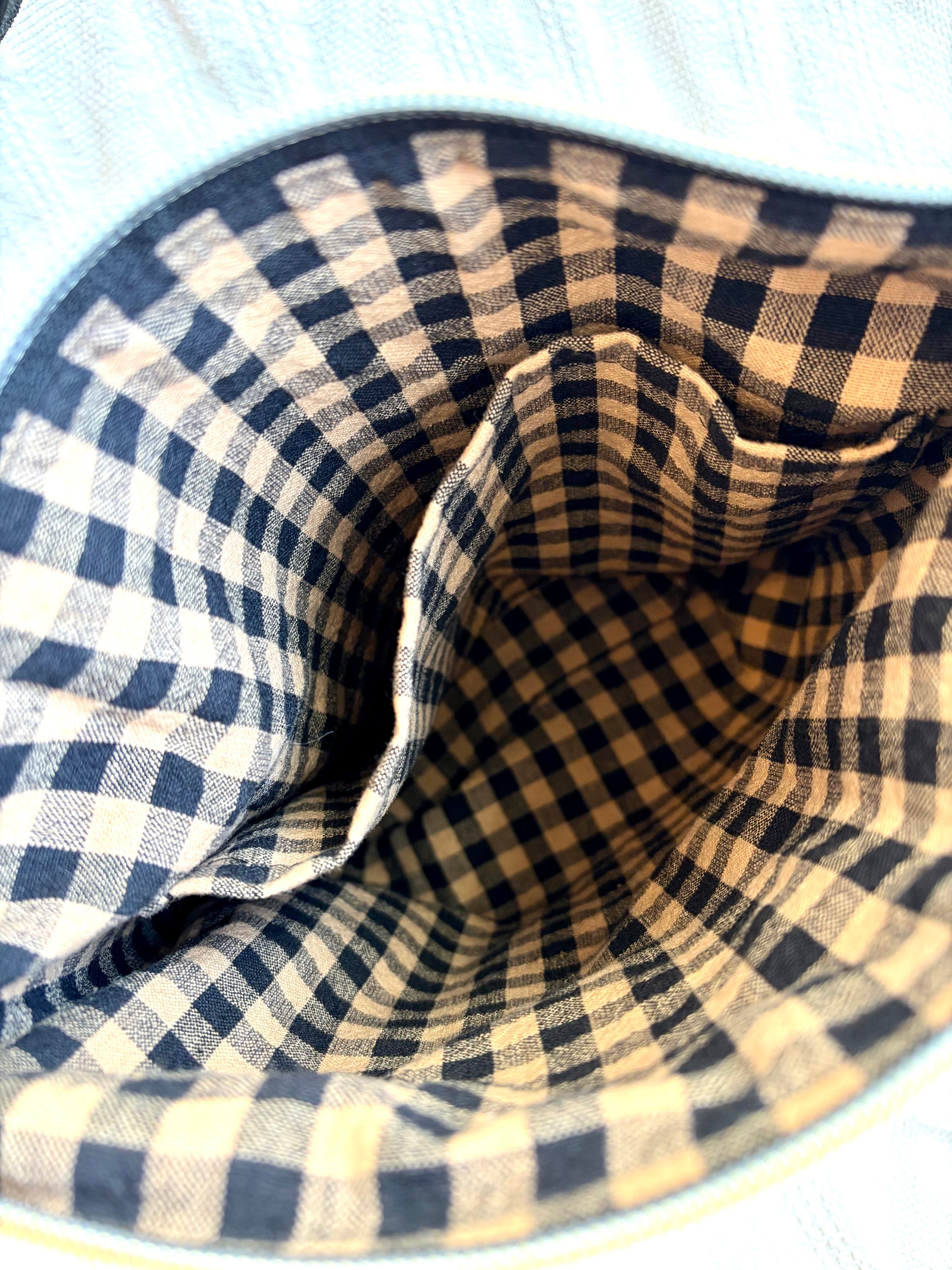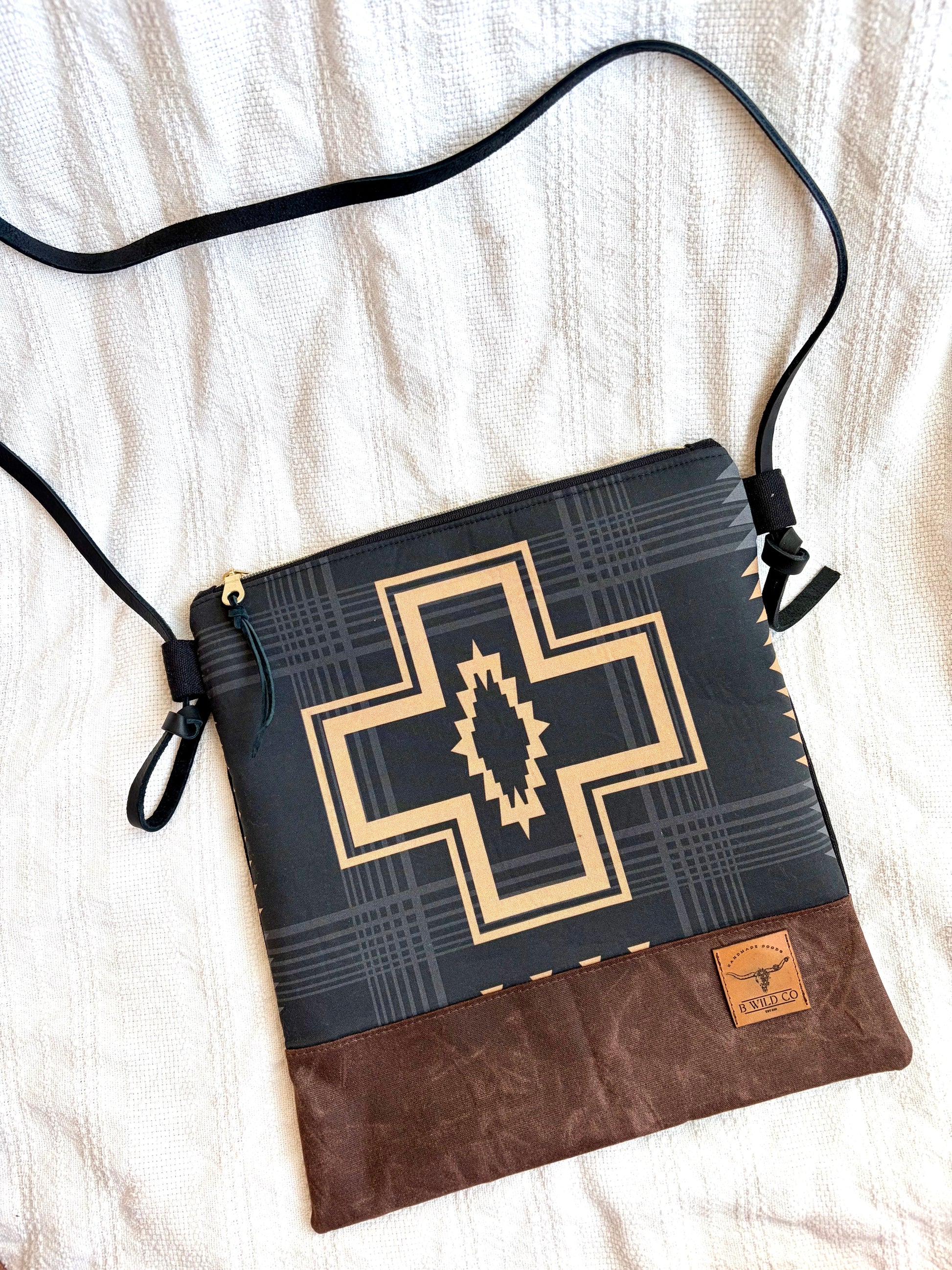 The upper is a beautiful Aztec cotton followed by a 100% waxed cotton canvas lower. The patina of the waxed canvas will only get better with time!🤎 on the back you’ll find a black cotton canvas in the upper followed by the waxed canvas lower. The lining is a soft homespun cotton!